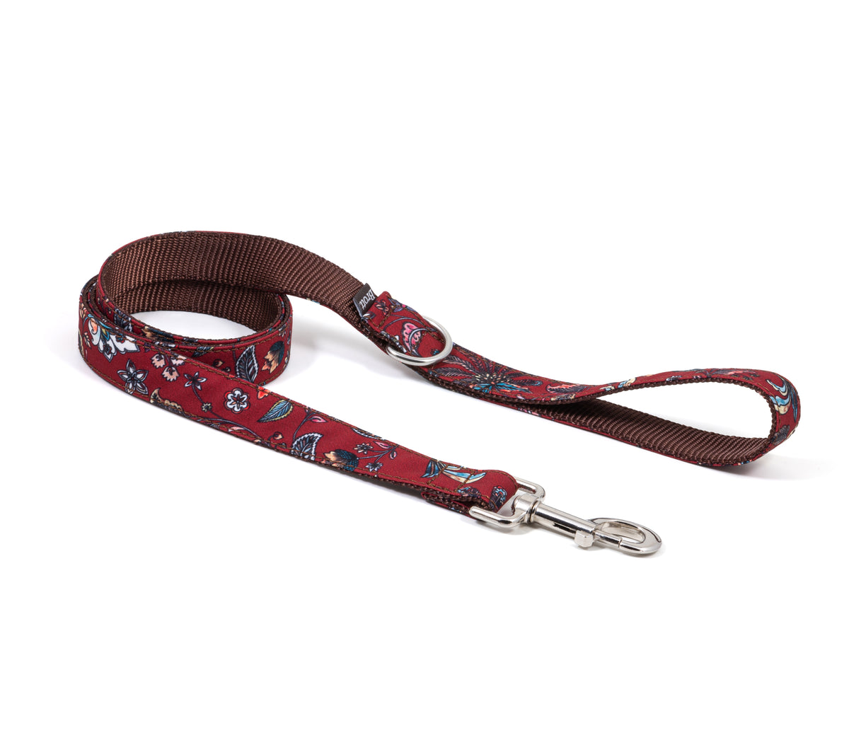 ボルドーカラーに華やかな装飾花柄をあしらった首輪で、愛犬との散歩をもっとスタイリッシュに。