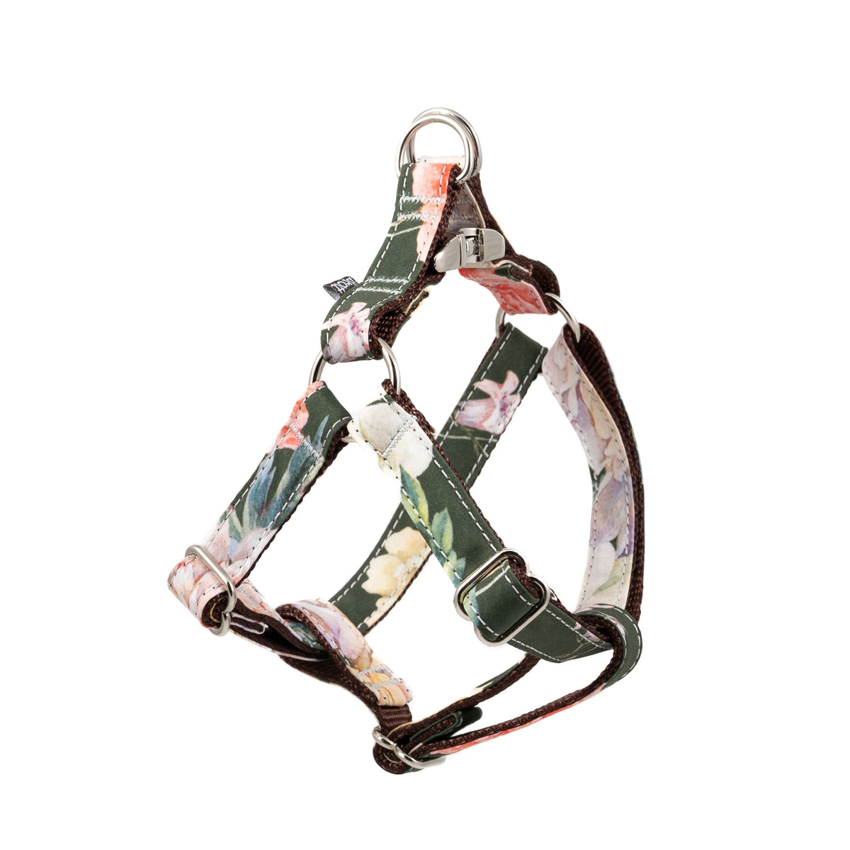 深いグリーンの生地に映える、暖かみのある大きな花柄が目を引き愛犬とのお散歩をよりスタイリッシュに演出します。