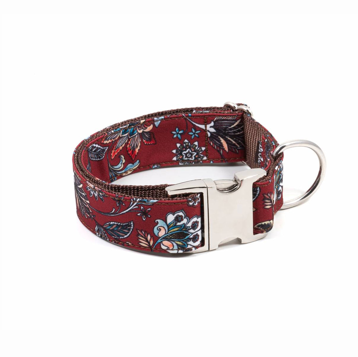 ボルドーカラーに華やかな装飾花柄をあしらった首輪で、愛犬との散歩をもっとスタイリッシュに。
